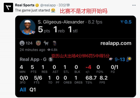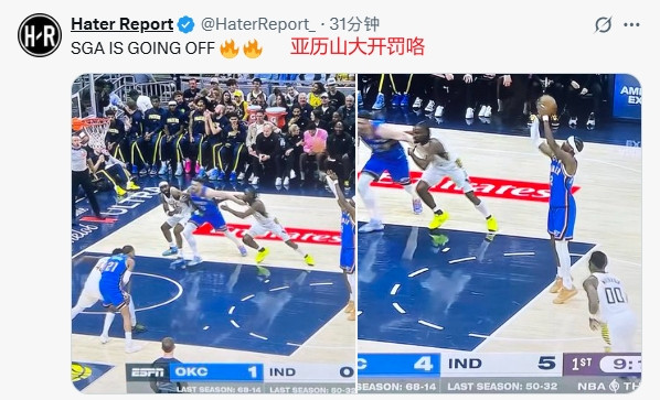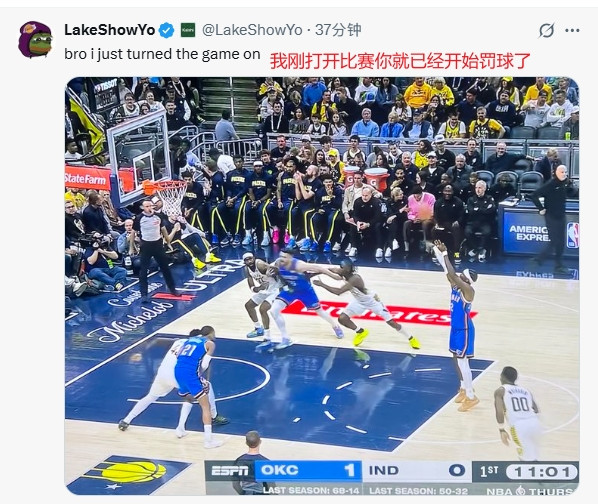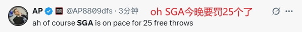 NBA常规赛,雷霆VS步行者正在进行当中。雷霆当家球星亚历山大开场59秒便站上罚球线,首节出战6分钟有7个罚球!美网友在社交媒体上谈到了亚历山大的表现:
